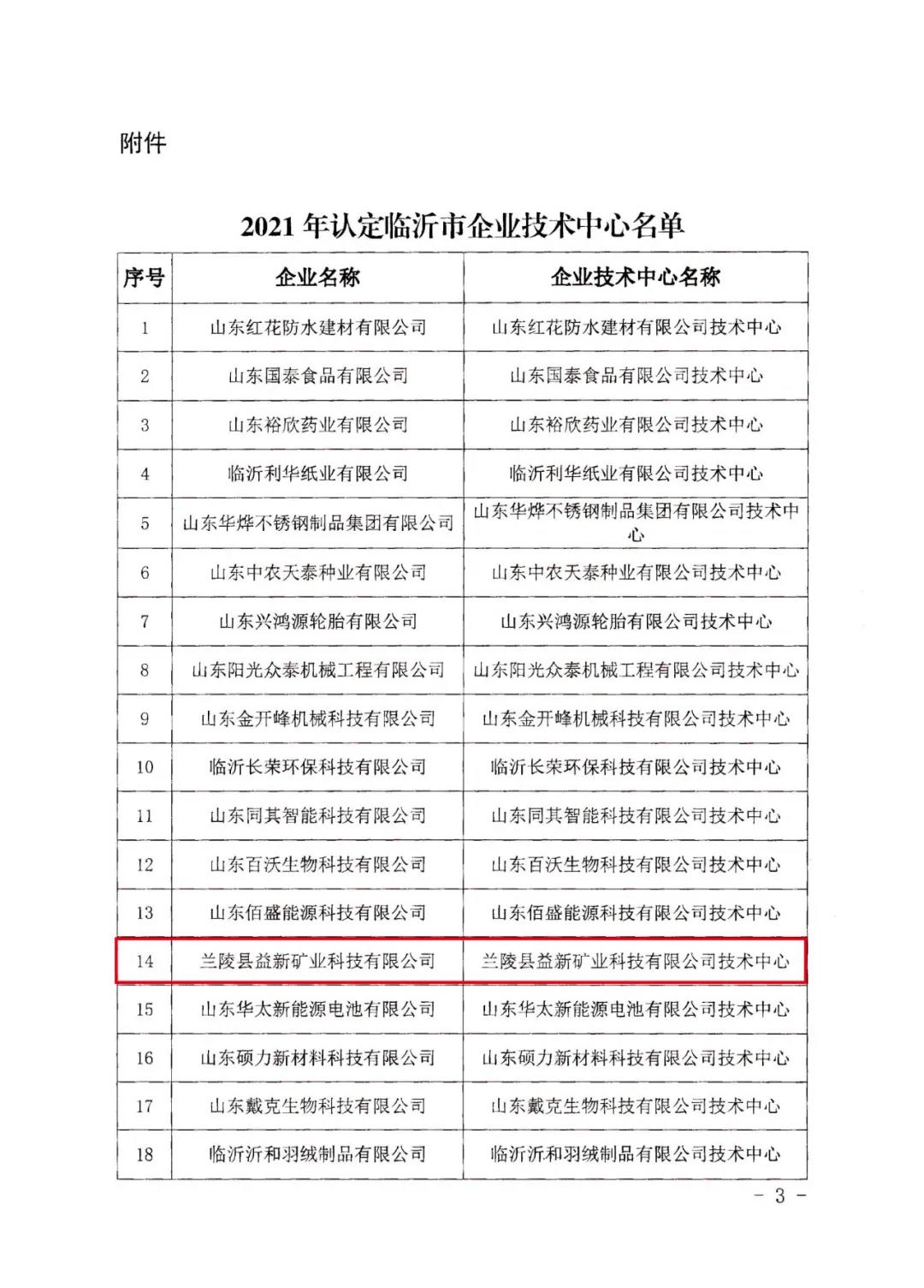 临沂市发展和改革委员会公布了2021年认定临沂市企业技术中心名单,兰陵县益新矿业科技有限公司上榜了!!!